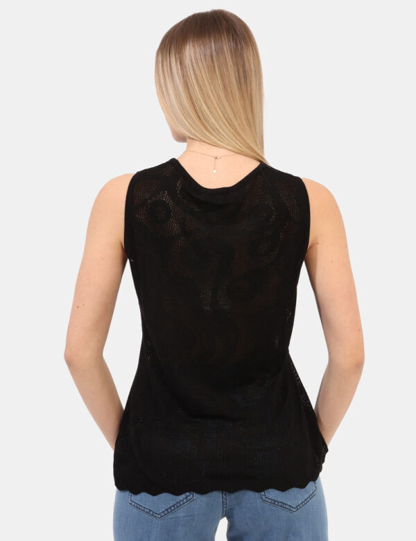 Top a giromanica in total nero traforato. La vestibilità è morbida e regolare. Il top è adatto per occasioni casual e facilmente combinabile. Praticità e stile in un solo capo.