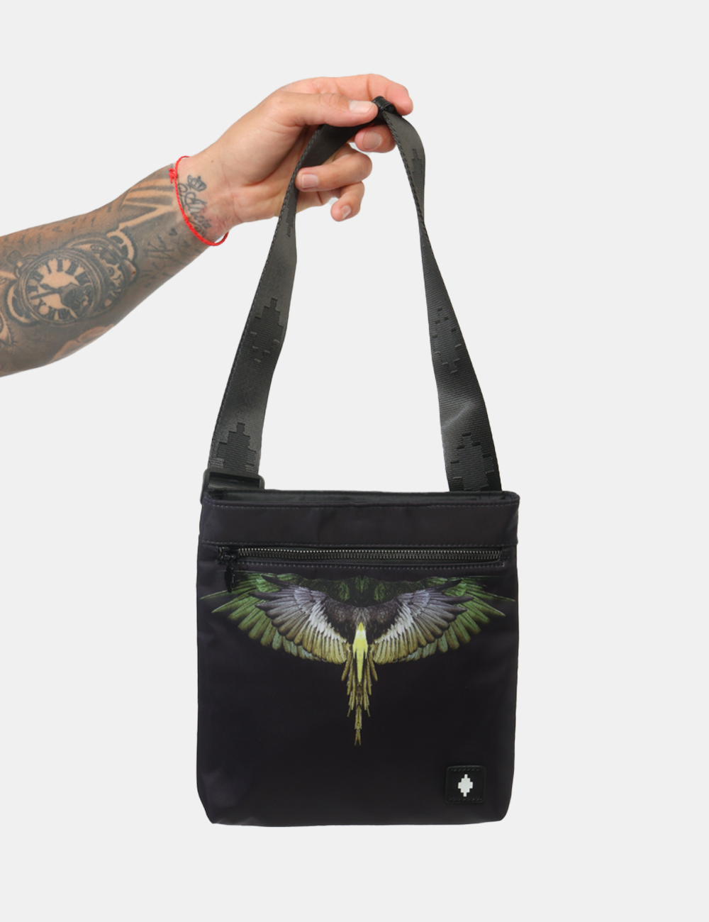 Il design è arricchito dall’iconica stampa ali, elemento grafico simbolo del brand che dona personalità e carattere al modello. La presenza della tracolla regolabile assicura una vestibilità personalizzata e comoda, adattandosi facilmente alle tue esigenze. Le dimensioni compatte – base inferiore di 25 cm, altezza massima di 23 cm e profondità di 1 cm – la rendono perfetta per portare con te l’essenziale in modo ordinato e pratico.
