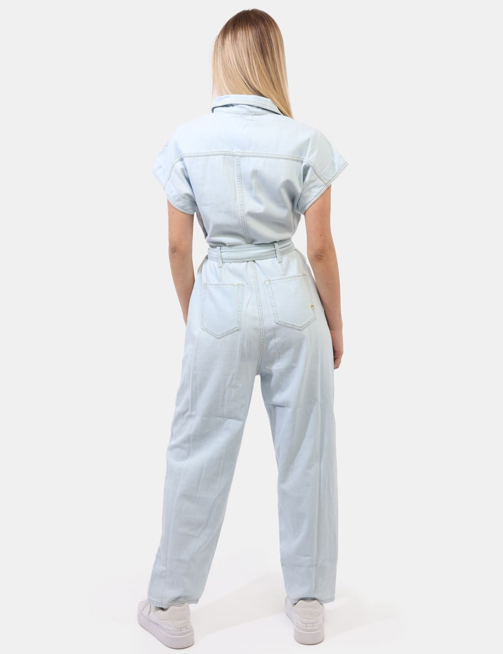 Tuta a maniche corte in total blu denim light, con tasche a taglio trasversale sul fronte e tasche a toppa sul retro. La vestibilità è morbida e pratica grazie a bottoni ad asola lungo il fronte, più cintura in tessuto. La tuta è adatta per occasioni casual. Indossala per essere sempre a tuo agio.