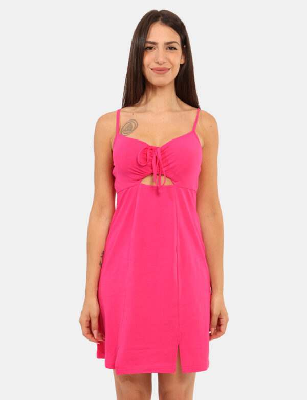 Abito corto in total fucsia, con spalline strette regolabili e scollo arricciato. La vestibilità è morbida e regolare. Il capo è adatto per occasioni casual e facilmente combinabile. Dona un tocco di colore ai tuoi outfit.