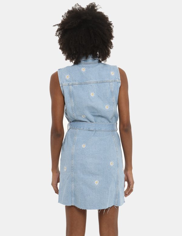 Abito a giromanica in total denim light con stampa allover ricamata di margherite bianche. Presenti tasche a toppa sul fronte con chiusura affidata a bottone ad asola. La vestibilità è morbida e pratica grazie a bottoni ad asola argentati sul fronte e regolabile grazie a cintura in denim. Il vestito è adatto per occasioni casual e ideale per outfit diurni. Inseriscilo nel guardaroba se vuoi spiccare con stile.