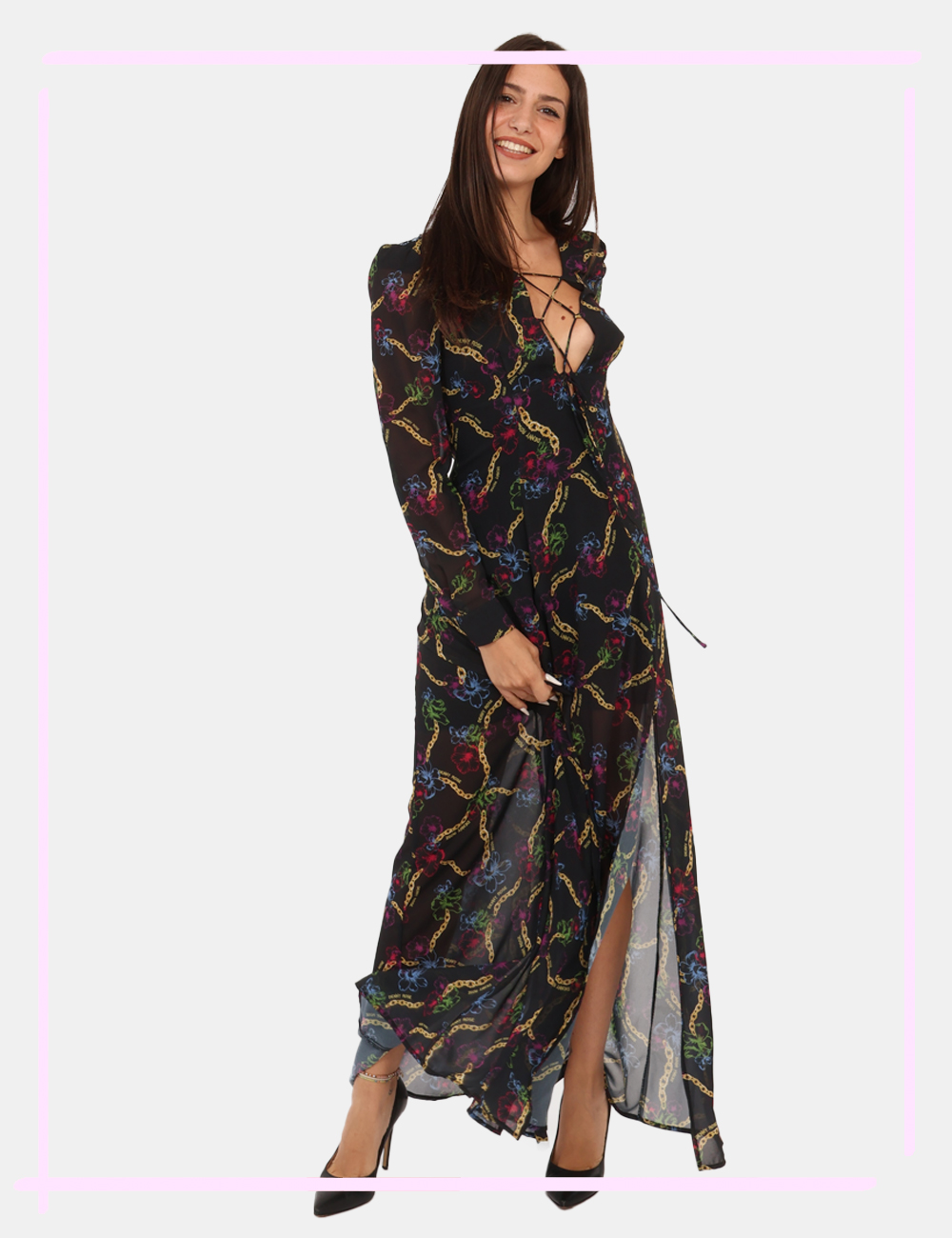 Vestito lungo a maniche corte, su base nera con stampa floreale beige. La vestibilità è morbida e regolare. Il vestito è adatto per occasioni casual e facilmente combinabile con numerosi accessori. Indossalo per essere sempre impeccabile.