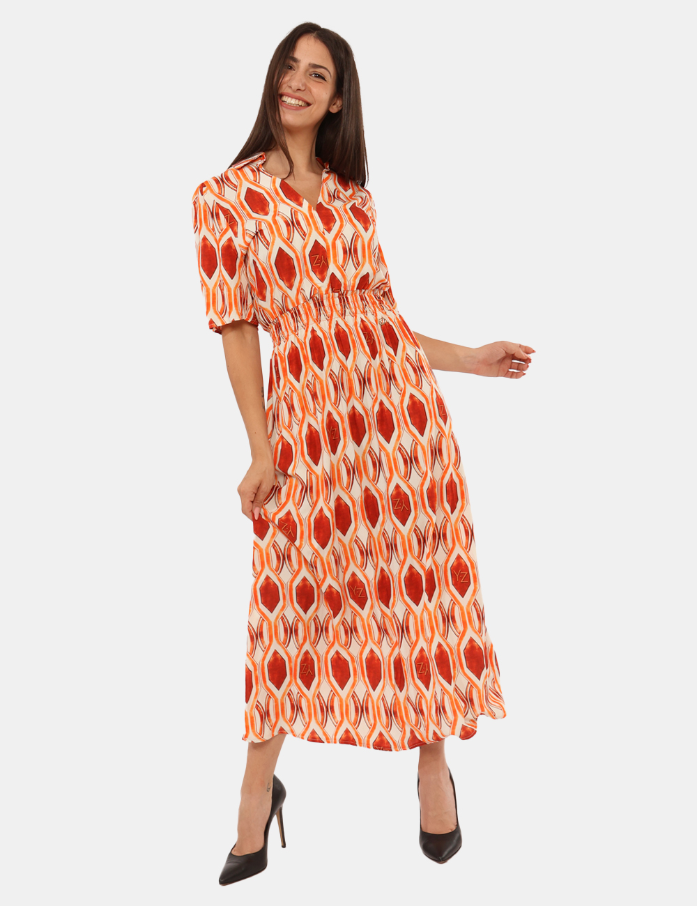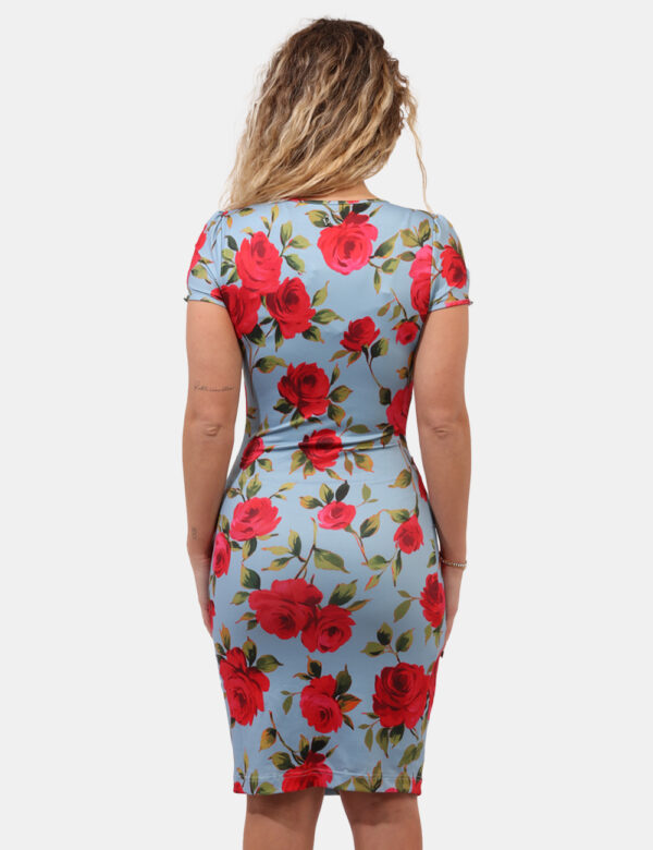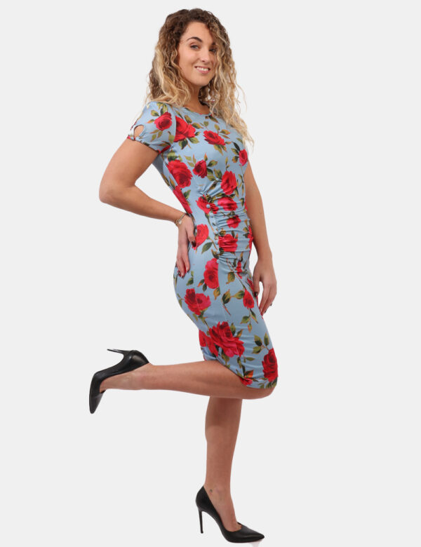 Vestito a maniche corte, in tessuto lucido, su base azzurro pastello con stampa allover floreale rossa. Ulteriore dettaglio è rappresentato da arricciatura laterale con fake bottoni ad asola. La vestibilità è morbida e regolare. L’abito è adatto per occasioni casual/raffinate e facilmente combinabile. Dona un tocco di stile ai tuoi outfit.