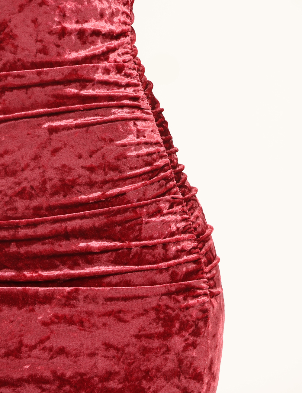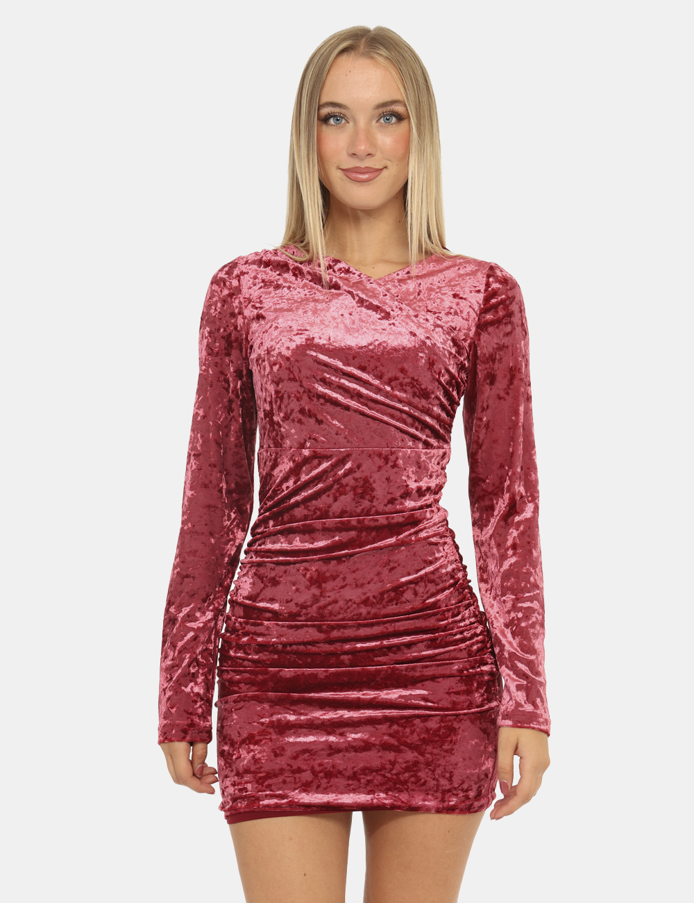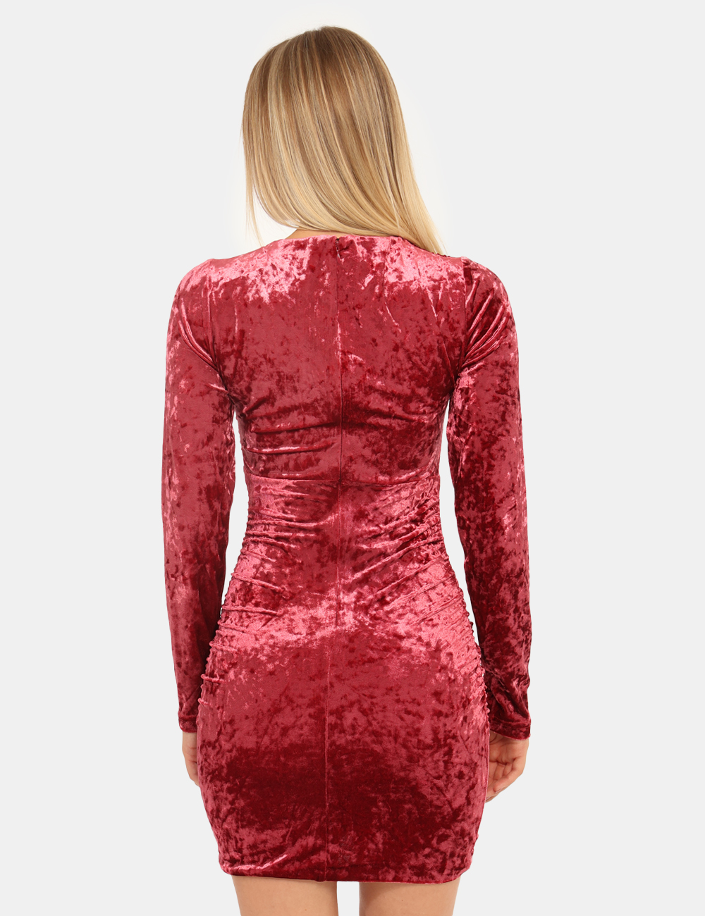 Vestito corto in simil velluto, con maniche lunghe, taglio incrociato ed in total bordeuax. La vestibilità è morbida e pratica grazie a zip sul retro. Il vestito è adatto per occasioni casual/raffinate e facilmente combinabile con numerosi accessori. Questo capo merita una serata importante.
