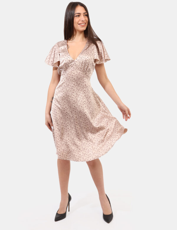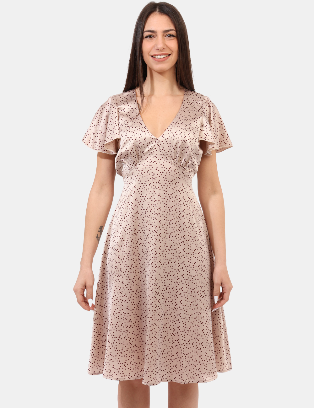 Vestito a maniche corte in tessuto leggero, su base beige con stampa a pois sul marrone. Presente scollo a V cintura in girovita. La vestibilità è morbida e pratica grazie a zip sul retro. L’abito è adatto per occasioni casual/raffinate. Dona un tocco di freschezza ai tuoi outfit.