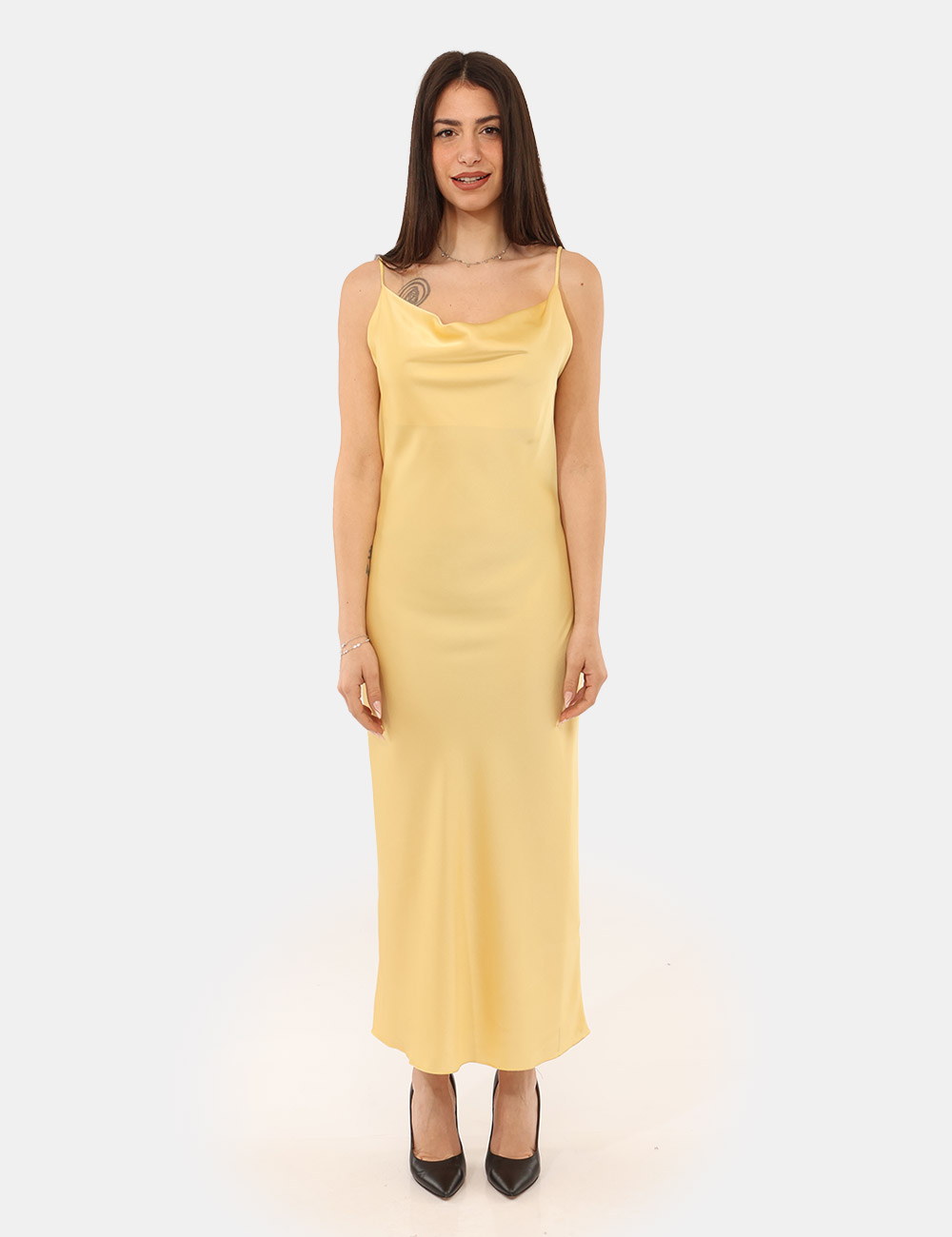 Questo vestito da donna adatto alla primavera estate è ideale per le occasioni speciali, soprattutto di sera, quando vuoi indossare qualcosa di femminile e d’impatto senza rinunciare alla semplicità. Il colore giallo dona energia e luminosità al look, perfetto per valorizzare l’abbronzatura e aggiungere un tocco fresco e sofisticato al tuo stile. La modella è alta 172 cm e indossa la taglia S, confermando una vestibilità equilibrata e confortevole.