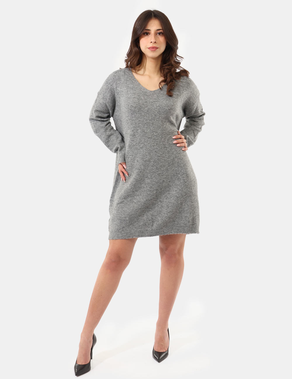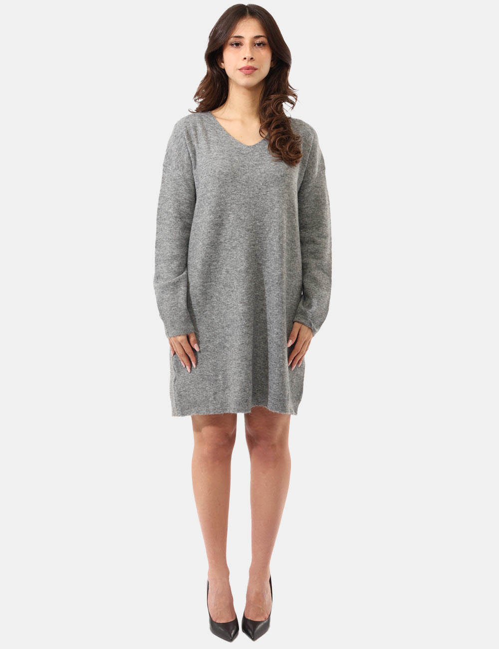 Vestito in maglina, misto lana, maniche lunghe, scollo a V e total grigio medio. La vestibilità è morbida e regolare. Il capo è adatto per occasioni casual e facilmente combinabile con numerosi accessori. Dona un tocco di stile ai tuoi outfit invernali.