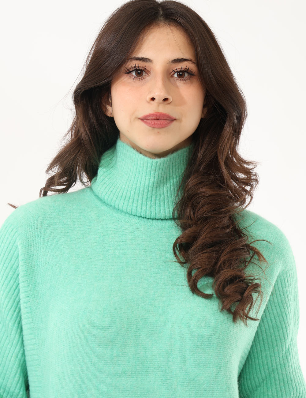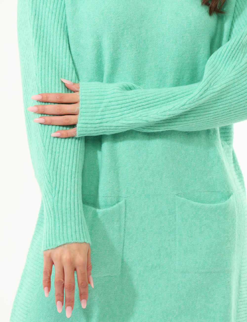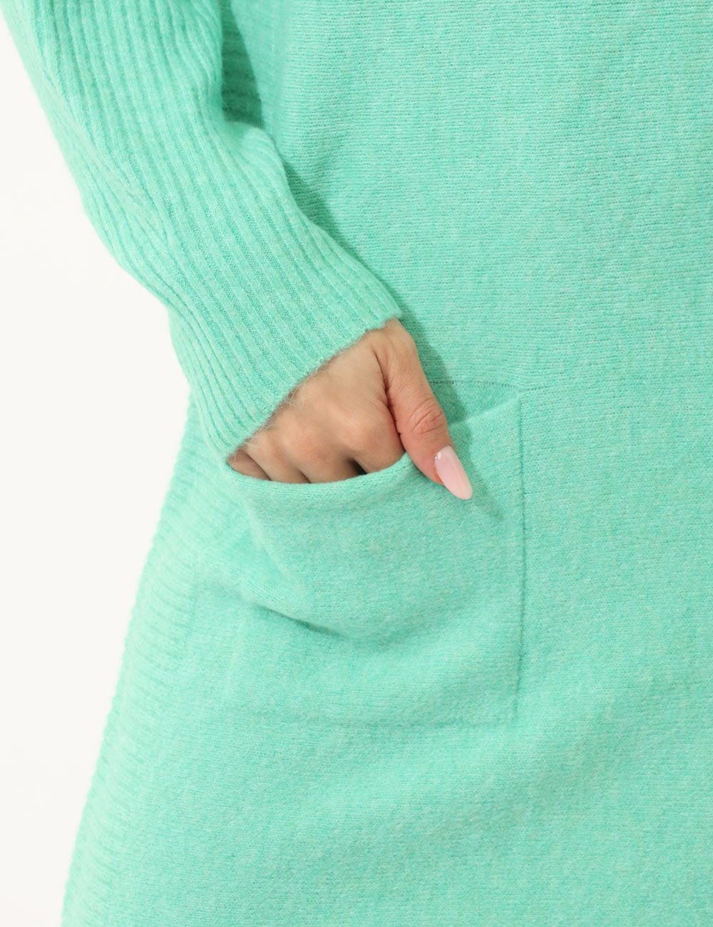Vestito in maglina a collo alto, misto lana, maniche lunghe, tasche a toppa e total verde pastello. La vestibilità è morbida e regolare. Il vestito è adatto per occasioni casual e facilmente combinabile con numerosi accessori. Dona un tocco di morbidezza ai tuoi outfit invernali.