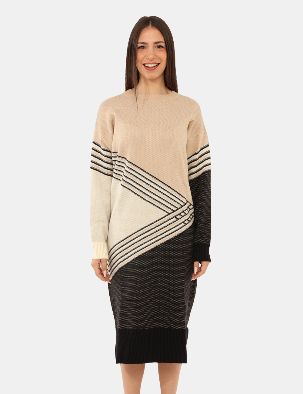 Vestito con maniche lunghe, invernale, su fantasia beige, bianca e nera con collo alto. La vestibilità è morbida e regolare. L’abito è adatto per occasioni casual e combinabile con numerosi accessori. Affronta l’inverno con stile.
