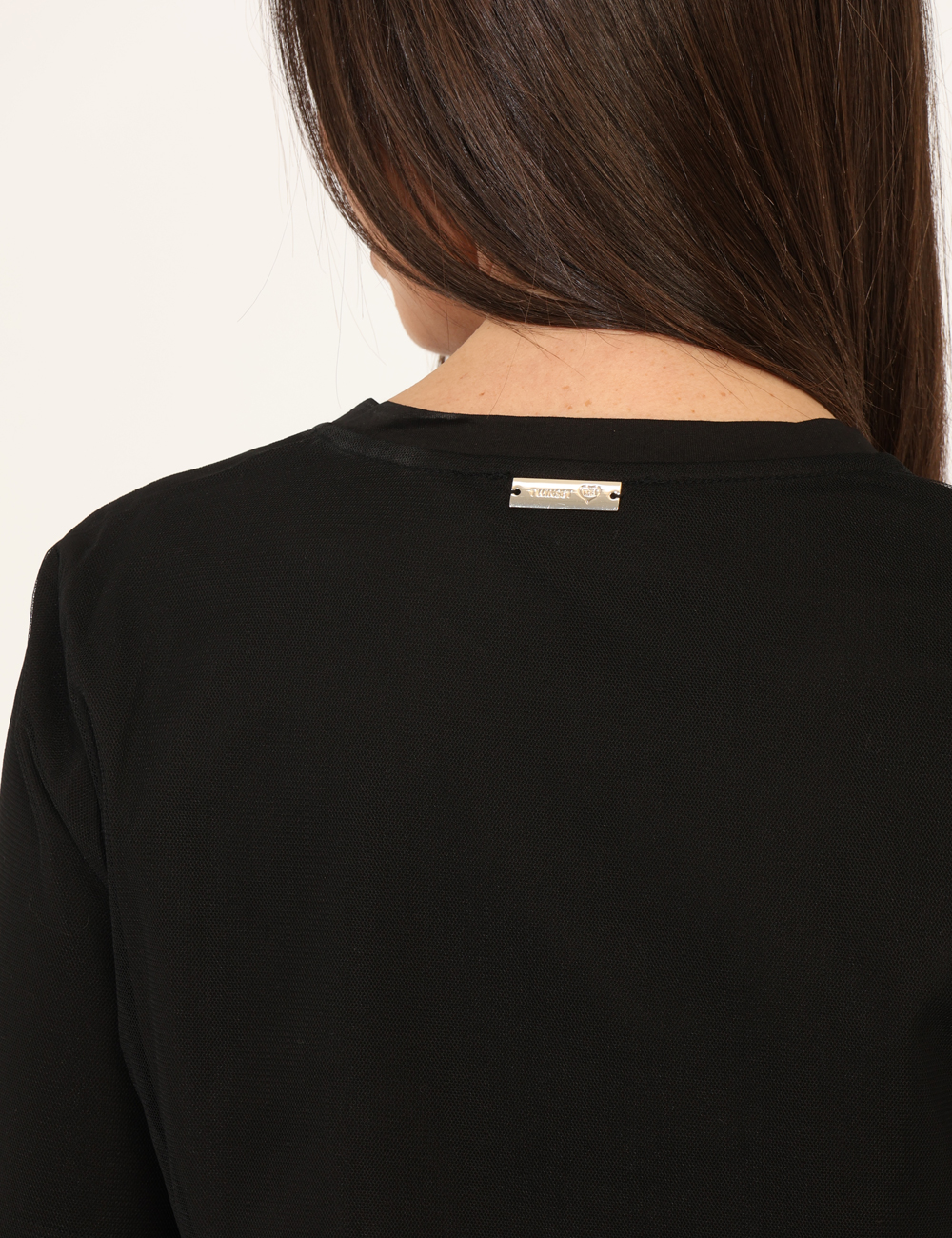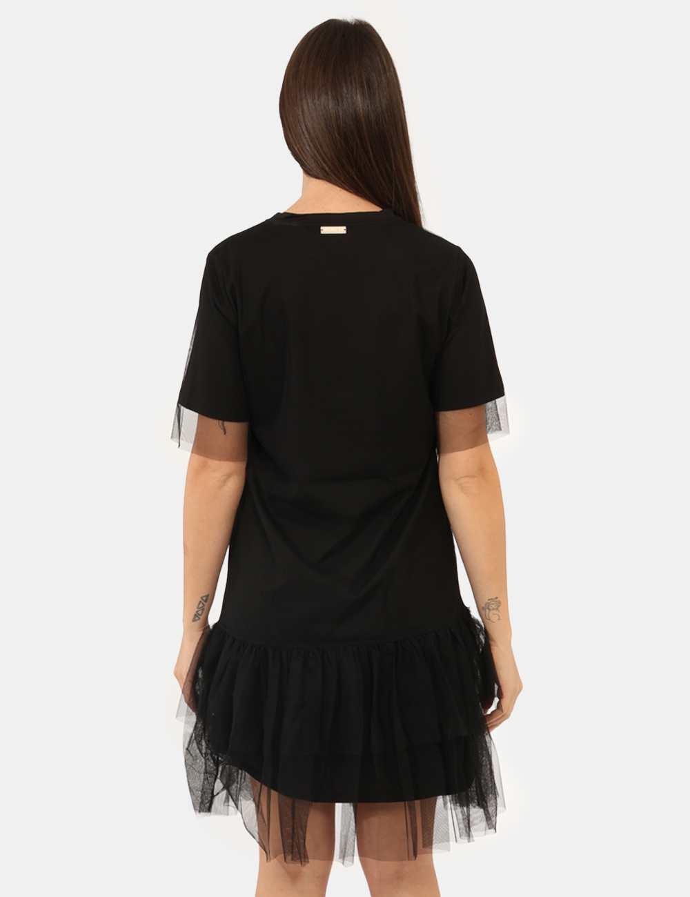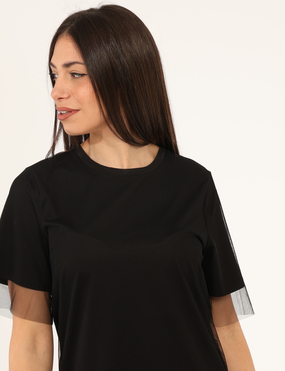 Vestito basico, a maniche corte, in total nero, ricoperto di strato velato in tono su tono. La vestibilità è morbida e regolare. L’abito è adatto per occasioni casual e facilmente combinabile con numerosi accessori. Il tuo prossimo articolo nei prodotti salvati.