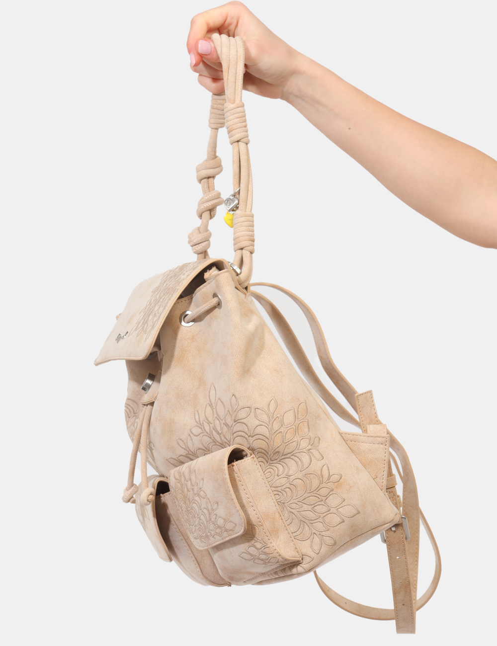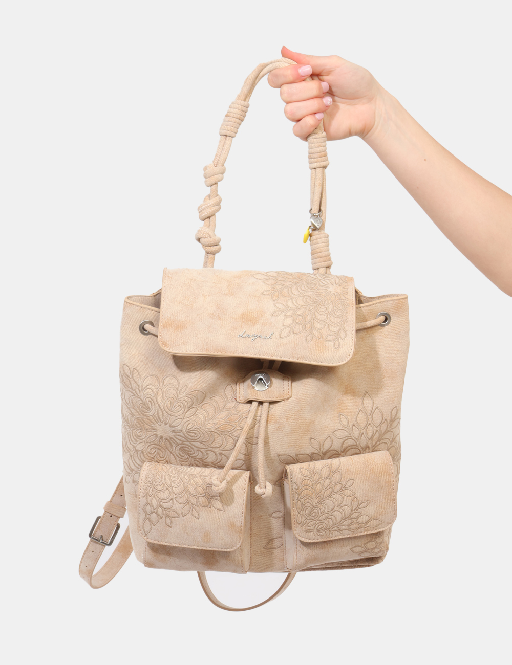 Lo zaino con doppia tasca frontale e ricami tono su tono firmato Desigual è pensato per chi ama accessori funzionali ma con un’estetica ricercata e senza tempo.